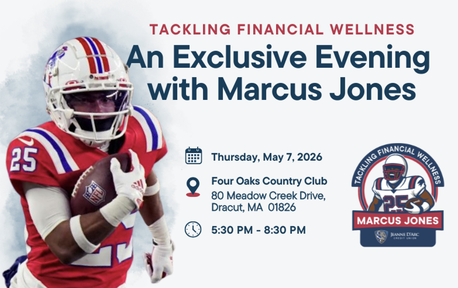 LOWELL, MA (April 15, 2026)– Jeanne D’Arc Credit Union will host a private benefit dinner with New England punt returner and cornerback Marcus Jones. “An Exclusive Evening with Marcus Jones - Tackling Financial Wellness” will be held May 7 at Four Oaks Country Club in Dracut, Massachusetts, and is limited to 100 guests. Tickets are $125 per person , with all proceeds supporting a new grant program to expand financial education in local schools.
